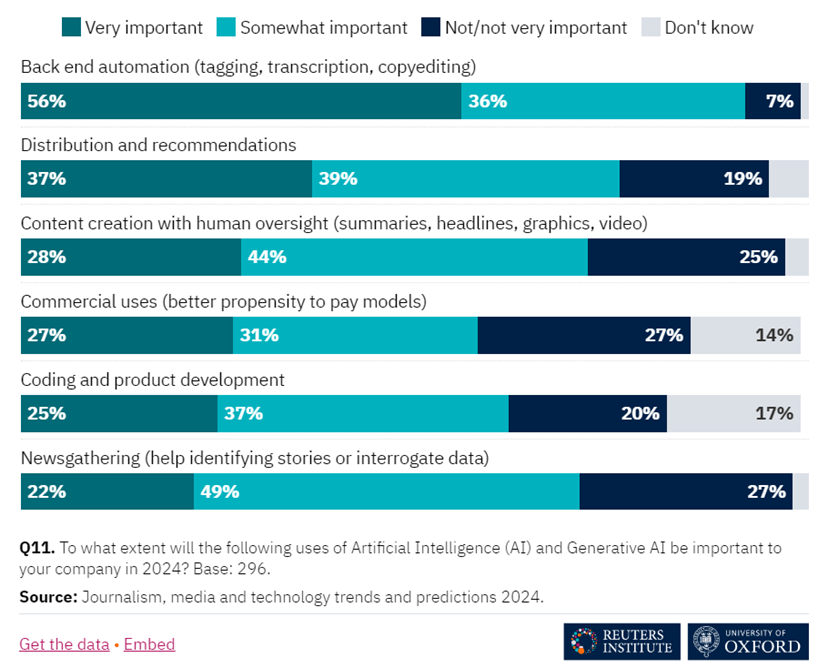 L’intelligenza artificiale ha rivoluzionato il modo in cui operano le redazioni, migliorando e semplificando numerosi processi. Un sondaggio condotto dal Reuters Institute ha rivelato che le attività più comunemente delegate all’AI nelle redazioni sono i processi di automazione back-end (56%), come la trascrizione e la correzione di bozze. Seguono poi sistemi di raccomandazione (37%), la creazione di contenuti sotto supervisione umana (28%) e scopi commerciali (27%). Infine, tra le attività meno affidate all’IA troviamo la programmazione (25%) e la raccolta di notizie (22%).