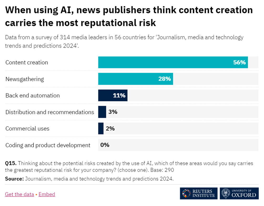 Nonostante l’intelligenza artificiale sembri ormai capace di eseguire una vasta gamma di operazioni, è fondamentale resistere alla tentazione di affidarle completamente i nostri compiti senza alcuna preoccupazione. Le attività delegate all’AI dovrebbero essere viste come un supporto al lavoro umano poiché presentano un margine di rischio. Secondo uno studio del Reuters Institute, il rischio reputazionale più elevato è associato alla produzione di contenuti (56%). Non sono pochi i casi di articoli pubblicati con degli errori. Tra questi, nel 2023, si è riscontrato che degli articoli generati automaticamente da CNET presentavano numerosi errori e carenze informative.