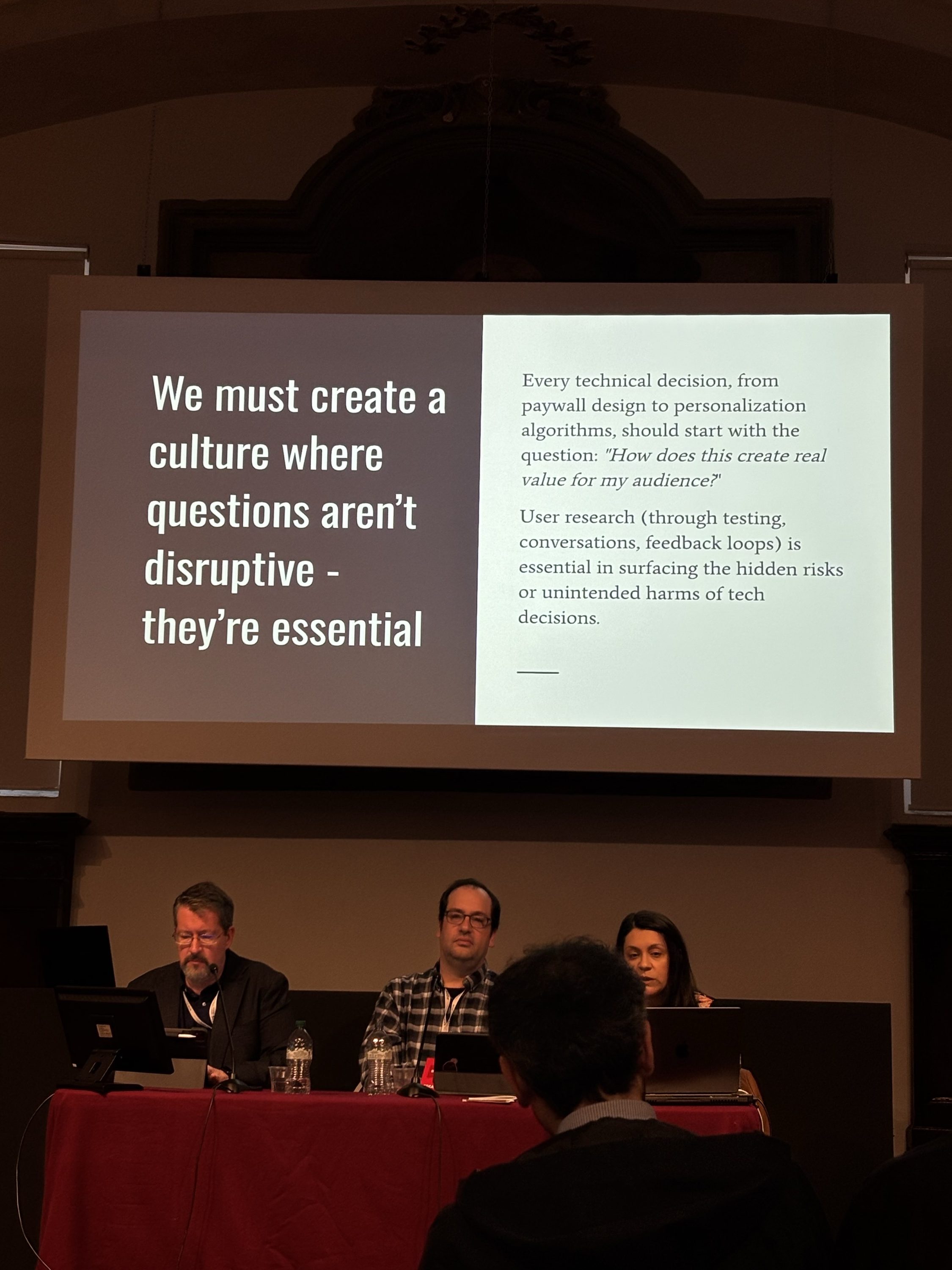 Felicitas Carrique, direttrice della News Product Alliance, e Nic Newman, senior research fellow del Reuters Institute, hanno posto al centro del dibattito una domanda cruciale: cosa significa davvero “product management” nel giornalismo? Secondo Carrique, ogni cosa creata per un pubblico e che genera uno scambio di valore può essere definita “product management”. Questo valore può essere un abbonamento pagato, l’attenzione del lettore o il tempo dedicato alla partecipazione attiva. Newman ha poi aggiunto che il product management è una funzione strategica, la chiave per massimizzare impatto e valore. Secondo alcuni dati del Reuters Institute, il 93% dei leader media riconosce l’importanza del product management, ma solo il 45% ritiene che il ruolo sia pienamente compreso all’interno delle redazioni. Questo mismatch è un segnale evidente: il prodotto è strategico, ma spesso viene ancora percepito come una funzione tecnica o esecutiva, non come parte integrante del processo decisionale.