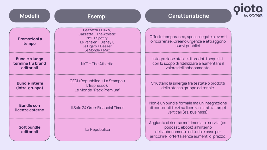 Nella tabella che segue riassumiamo i 5 tipi di strategie bundling editoriale appena descritte: